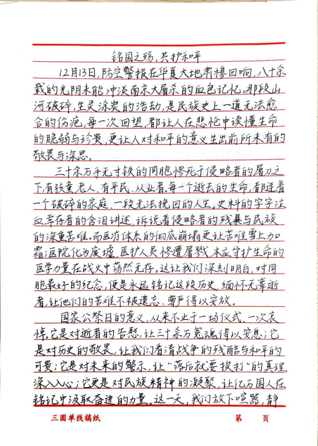 本次活动主要分为三部分,“影像忆史·青春传声”视频创作环节里,同学们以镜头为笔,用鲜活画面与真挚旁白记录对历史的感悟与对和平的期许,传递青年一代的家国情怀;“笔忆殇史·字载和平”征文活动中,大家以文字为媒,深挖史料细节追溯1937年的苦难岁月,诠释国家公祭日的深刻内涵;“笔悼先烈·医护家国”手抄报创作活动上,学子们将爱国情怀与医者使命相融,以细腻笔触绘就医者初心,践行守护和平的诺言。
