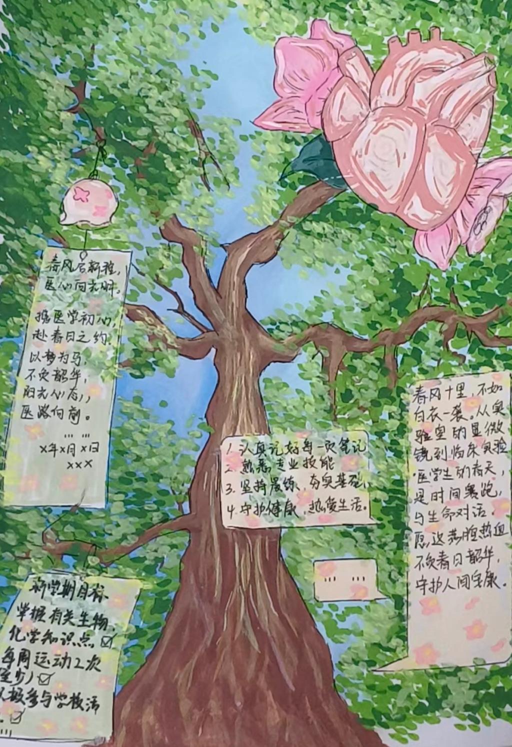 本次活动分三部分有序开展,旨在丰富校园文化生活,引导同学们调整心态、明确方向。活动包含“春日拾光,纸绘新程”主题绘画活动,同学们绘就春日校园景致,融入医学生新学期规划与健康心态倡导,让春日活力与医学专业素养自然相融;同期开展“春日笔耕,心向暖阳”主题征文活动,同学们以文字记录成长感悟、规划学习目标、交流心态调适方法,传递温暖向上的力量。活动还设置作品交流展示环节,通过互评互赏深化内涵,让大家在交流中明晰成长方向,积蓄前行动力。